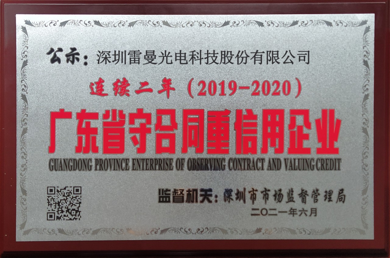 人無信不立,業(yè)無信不興。誠信經(jīng)營是企業(yè)持續(xù)發(fā)展的基石。近日,廣東省市場監(jiān)督管理局再次授予雷曼光電2020...