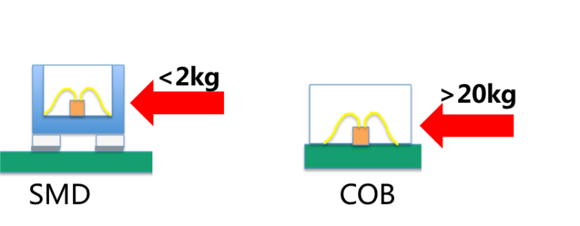 從失效機(jī)理上看,1010小間距常見的不亮現(xiàn)象,其原因有可能是外封膠與支架剝離或者外力撞擊導(dǎo)致金線斷開。為此,我們通過失效分析找出了失效原因,從而針對(duì)膠水密封性或者膠水力學(xué)性能進(jìn)行進(jìn)一步設(shè)計(jì)。同時(shí),我們的COB技術(shù)取消了SMD的支架與SMT回流焊環(huán)節(jié),無虛焊風(fēng)險(xiǎn),可靠性更高。在推力測試中,雷曼COB承受推力是SMD燈至少10倍以上,燈珠防撞能力更強(qiáng)。