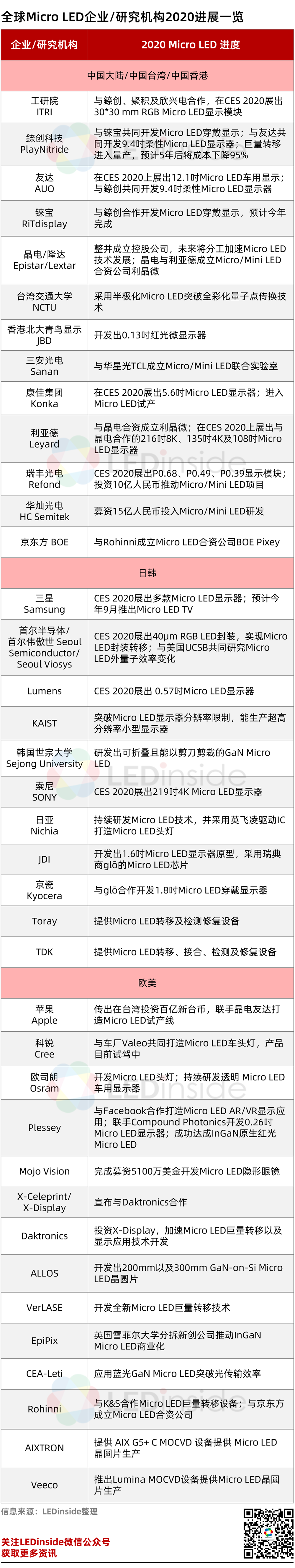 其他全球廠商的最新Micro LED進(jìn)展請(qǐng)參考以下LEDinside整理: