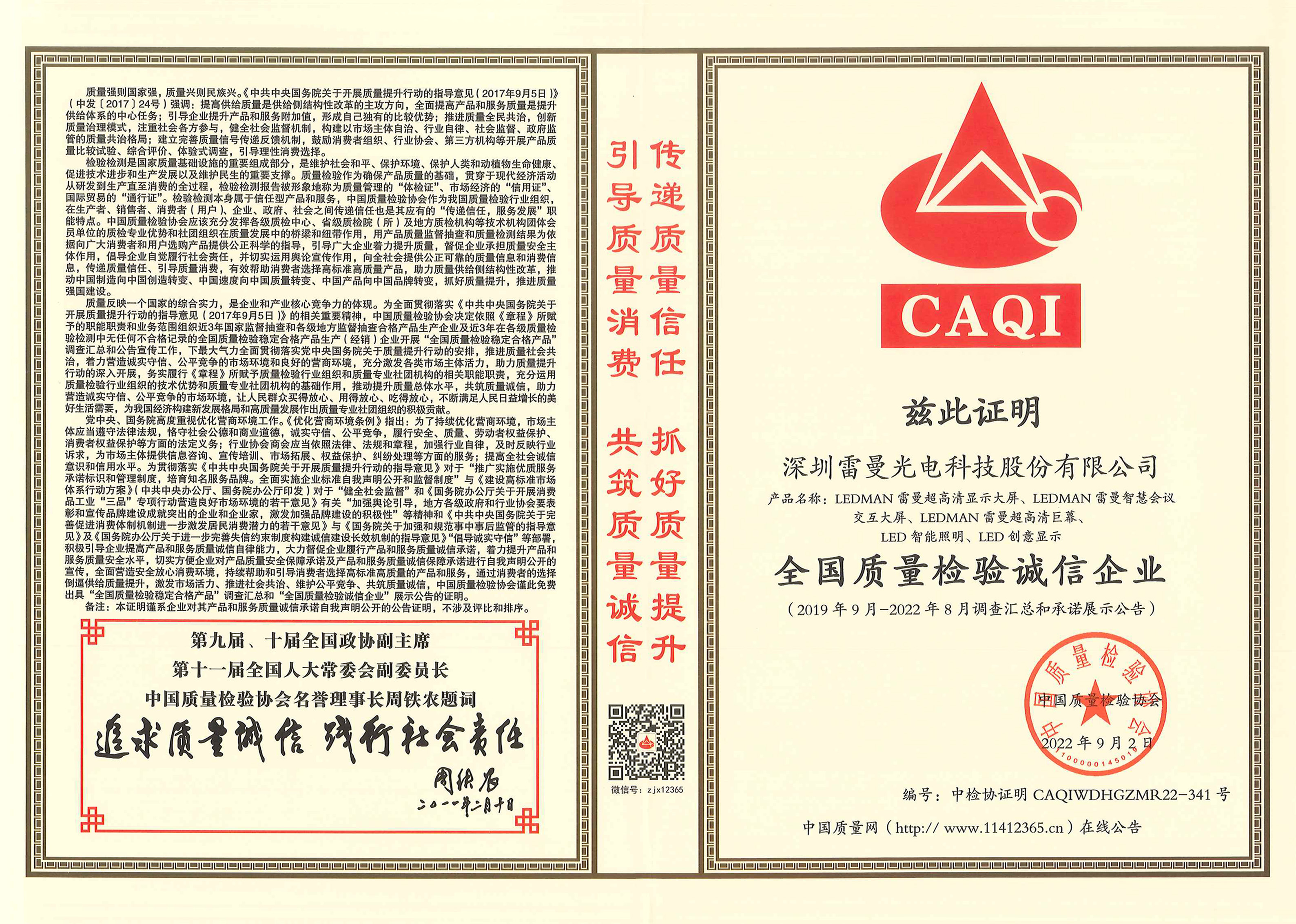 金秋九月,雷曼光電以卓越的品質和高標準的工藝技術,經過重重篩選及嚴格的審核,在2022全國“質量月”活動中榮獲“全國LED顯示屏行業(yè)質量領先企業(yè)”、“全國質量檢驗誠信企業(yè)”、“全國質量信譽保障產品”三重權威認證。
