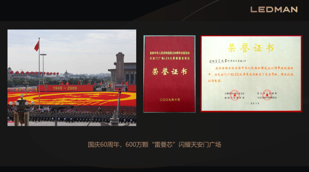 2009 年,雷曼光電成為新中國成立60周年慶典上,天安門廣場超大顯示屏唯一指定國產LED封裝品牌,從進口和國產之爭中脫穎而出,成為了有擔當的民族品牌,向世界完美展示“中國智造”的實力與魅力。
