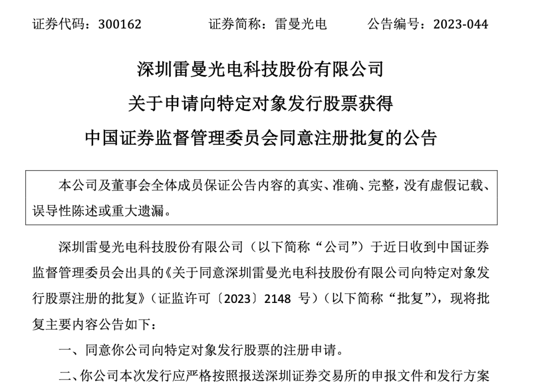9月12日,雷曼光電提交了定增計(jì)劃說(shuō)明書(shū),28日就得到了證監(jiān)會(huì)的批復(fù)同意(有效期12個(gè)月內(nèi))。定增計(jì)劃為不超過(guò)104,853,009股,不超過(guò)發(fā)行前總股本30%,擬計(jì)劃募集不超過(guò)6.89億。其中募集金額中,雷曼光電COB超高清顯示改擴(kuò)建項(xiàng)目約5.4億,1.5億補(bǔ)充流動(dòng)資金。