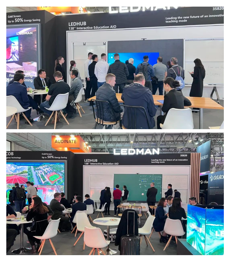 雷曼光電多年連續(xù)參展ISE,本年度首次攜雷曼高校數(shù)字交互教育顯示系統(tǒng)亮相。ISE展現(xiàn)場(chǎng),這一創(chuàng)新產(chǎn)品吸引了不少參展觀眾的眼球。他們表示這是首次看到這一具有創(chuàng)新突破性的產(chǎn)品,并紛紛上前體驗(yàn)了同屏?xí)鴮?xiě)和四分屏?xí)鴮?xiě)等功能,“全沉浸、強(qiáng)交互和高實(shí)時(shí)”的教學(xué)場(chǎng)景新體驗(yàn)引來(lái)連連贊嘆。