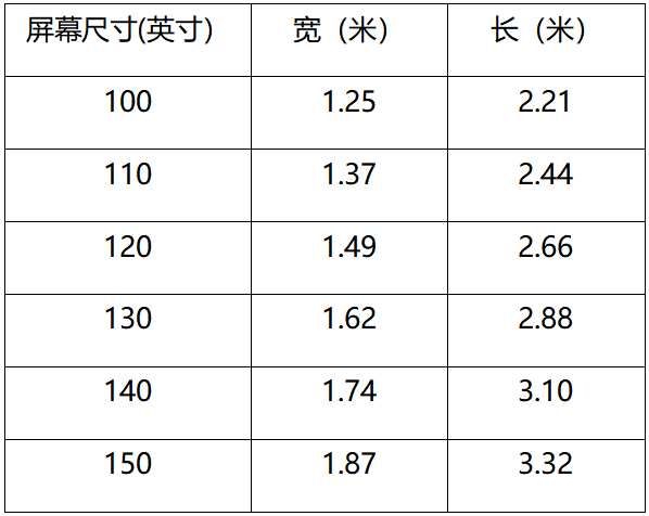 液晶顯示技術(shù),100英寸以上電視的另外一個(gè)問題是運(yùn)輸、入戶困難。下表是100英寸到150英寸電視的長寬尺寸。