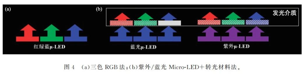 全彩化技術(shù):Micro-LED的全彩化技術(shù)主要有4種:三色RGB法、紫外/藍(lán)光Micro-LED+轉(zhuǎn)光材料法、透鏡合成法和特殊結(jié)構(gòu)法。三色RGB法用于大像素顯示構(gòu)造時(shí),巨量轉(zhuǎn)移的芯片數(shù)量多、難度大,且紅光LED效率不高。第二種方法則對(duì)轉(zhuǎn)光材料的可靠性和波長(zhǎng)一致性有很高的要求。而目前的熒光粉材料顆粒尺寸大,易造成沉積不均勻。量子點(diǎn)材料尺寸小,但是存在穩(wěn)定性較差且壽命短等問(wèn)題。透鏡合成法雖然簡(jiǎn)單,但是使用范圍窄,僅適用于投影儀的構(gòu)建。最后一種方法雖然能夠同時(shí)避免使用高成本的巨量轉(zhuǎn)移和色轉(zhuǎn)換材料,但是尚處在研究階段,并不成熟。