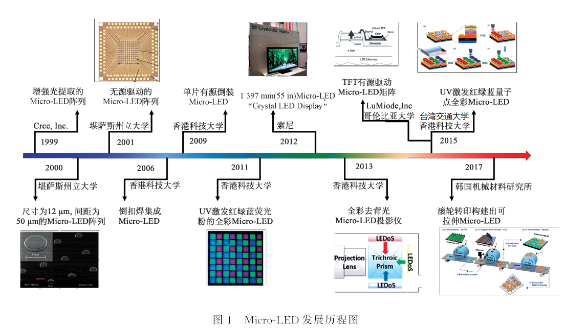 Micro-LED顯示技術(shù)是繼藍(lán)光GaN材料和白光LED照明之后LED領(lǐng)域的最重要進(jìn)展之一。圖1簡(jiǎn)單回顧了Micro-LED的發(fā)展歷程,從中可以發(fā)現(xiàn)這一領(lǐng)域重要進(jìn)展都是來(lái)自于集成工藝的突破??梢灶A(yù)期,未來(lái)Micro-LED顯示的發(fā)展仍將朝著微縮化、集成化、陣列轉(zhuǎn)移化和全彩化進(jìn)一步發(fā)展。