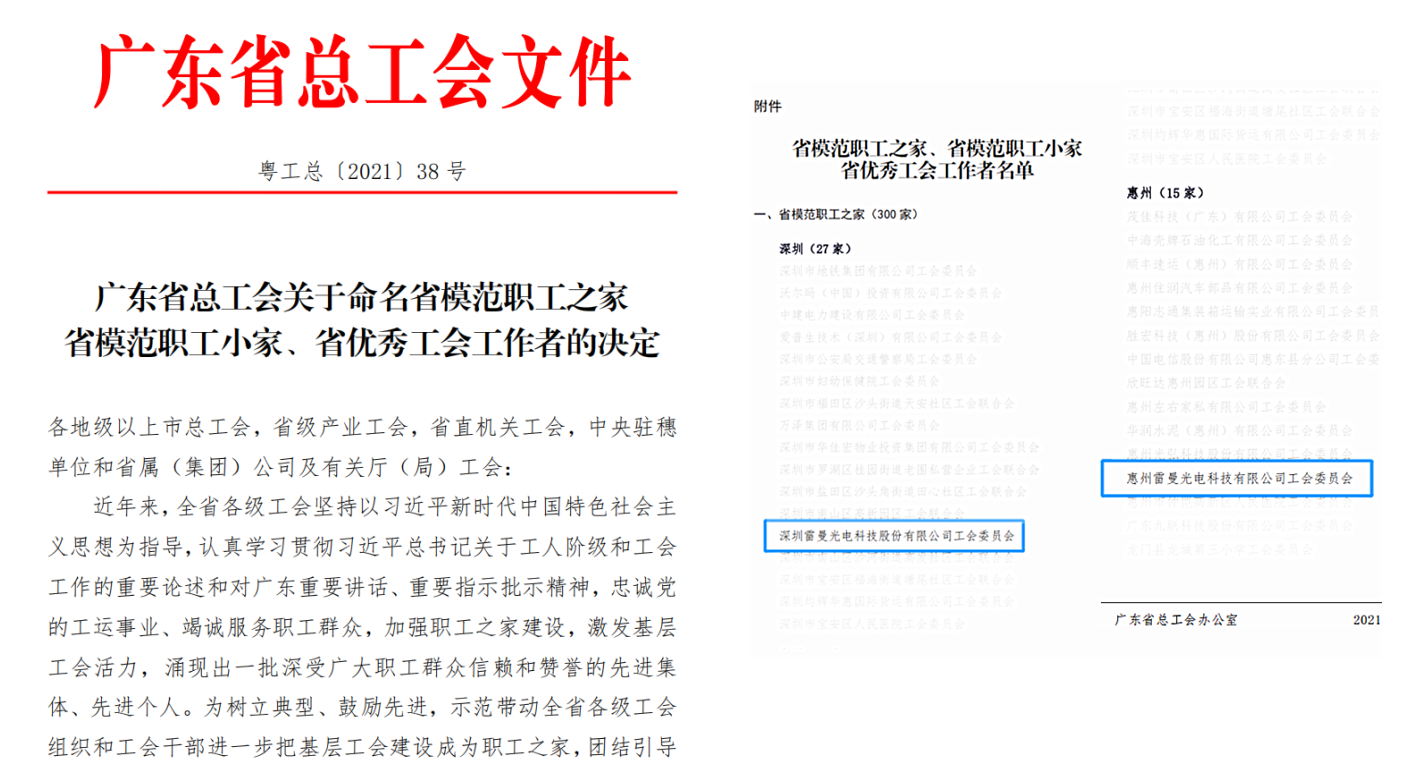 近日,廣東省總工會下發(fā)《關于命名省模范職工之家、省模范職工小家、省優(yōu)秀工會工作者的決定》(粵工總【2021】38號),深圳雷曼光電科技股份有限公司工會委員會、惠州雷曼光電科技有限公司工會委員會均獲“廣東省模范職工之家”命名。