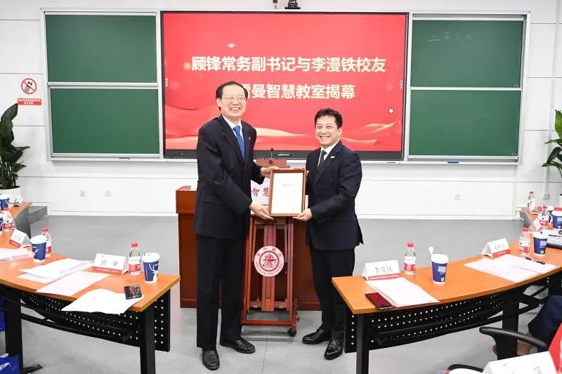 顧鋒與李漫鐵共同為智慧教室教育顯示系統(tǒng)揭幕,并頒發(fā)捐贈證書。吳靜怡向李漫鐵致感謝狀。