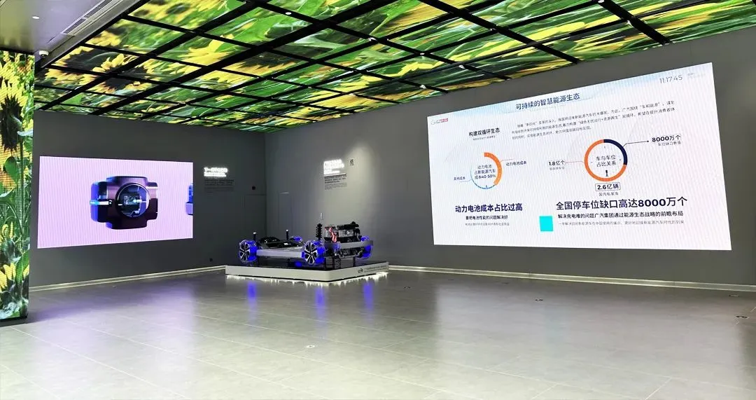 進入館內,首先映入眼簾的便是展陳的炫酷明星車型以及背景大屏,大屏采用一塊COB小間距屏、兩塊透明冰屏,超清畫質與通透畫面組合顯示,向訪客呈現(xiàn)廣汽的品牌發(fā)展歷程、數字孿生平臺與埃安車輛運營數據。