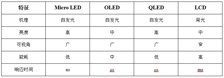 表1、Micro LED、OLED、QLED、LCD顯示技術(shù)主要特能對比
