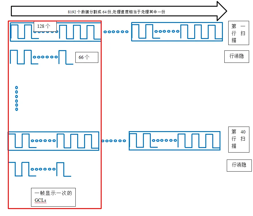 GCLK大小決定了總的運(yùn)行速度,它由灰度等級每個(gè)數(shù)據(jù)處理占有,行掃描數(shù)量進(jìn)行均分,以13灰度等級為例,以GCLKs代表一個(gè)時(shí)鐘單位,13位灰度數(shù)大小為8192,采用PWM作為數(shù)據(jù)處理,至少需要8192個(gè)GCLKs,假如采用40掃,那么至少需要8192*40=327680個(gè)GCLKs,才能完整顯示一幀畫面一次,假如GCLK總量為30M左右,那么可以重復(fù)顯示的次數(shù)為30M/327680約=91,即視覺刷新率為91HZ,遠(yuǎn)遠(yuǎn)低于1000HZ,以及現(xiàn)在能達(dá)到的3840HZ,因此芯片內(nèi)部又引入了新的S-PWM技術(shù),S-PWM技術(shù)在這不展開細(xì)說,可以等同理解為把灰度等級分割處理,變成同樣規(guī)格的一塊一塊的小單元同步處理。比如13灰度等級8192,可以分割成128*64,相當(dāng)于分割成64份,那么同樣條件處理一份數(shù)據(jù)只有128GCLKs,視覺刷新頻率這30M/128/40約=5800HZ,刷新率提高明顯,這個(gè)數(shù)據(jù)是一個(gè)理想的狀態(tài),實(shí)際應(yīng)用時(shí),為去除每行掃描時(shí)余留的電量,會(huì)增加行掃描消隱時(shí)間條件,這個(gè)行消隱會(huì)加在每行行掃描之前,同樣會(huì)占用一定的GCLKs周期,這個(gè)GCLKs多少要根據(jù)實(shí)際我們開發(fā)的電路板,及燈珠狀態(tài)進(jìn)行調(diào)節(jié)到一個(gè)合適值,假如行消隱設(shè)置為2.2us,需占用2.2us*30M=66個(gè)GCLKs。