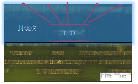 根據(jù)光在介質(zhì)傳輸過程中的透射和反射原理以及顯示面板光學(xué)模型設(shè)計(jì),封裝膠的光學(xué)設(shè)計(jì)會(huì)對出光率、色坐標(biāo)(色溫)、可視角、散熱溫升、對比度產(chǎn)生影響。例如:封膠材料厚度對光學(xué)影響大,膠越厚則越會(huì)明顯降低發(fā)光亮度和色溫,紅光芯片本身發(fā)光角度比藍(lán)綠光芯片小,再加上芯片表面封膠后經(jīng)過一系列的折反射,紅光折射率比藍(lán)綠光小,藍(lán)綠光出光視角進(jìn)一步放大,導(dǎo)致色溫偏差等。