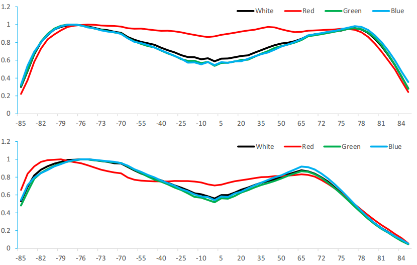 全彩Micro LED顯示屏是由一定數(shù)量的紅、綠、藍(lán)Micro LED芯片組成的像素拼成的,每種顏色Micro LED的亮度、波長的一致性決定了整個(gè)顯示屏的亮度、白平衡、色度一致。一般來說,顯示屏廠家要求芯片供應(yīng)商提供5nm的波長范圍及1:1.3的亮度范圍的LED芯片,這些指標(biāo)可由器件供應(yīng)商通過芯片測試設(shè)備進(jìn)行分級達(dá)到。電壓的一致性一般不做要求。由于Micro LED是有角度的,故全彩LED顯示屏同樣具有角度方向性,即在不同角度觀看時(shí),其亮度是會(huì)遞減或遞增的。目前藍(lán)綠芯片的主要發(fā)光角度為10°到170°,紅光芯片的主要發(fā)光角度為40°~140°。這樣,紅、綠、藍(lán)3種顏色LED的角度一致性將嚴(yán)重影響不同角度白平衡的一致性,直接影響顯示屏視頻顏色的保真度。