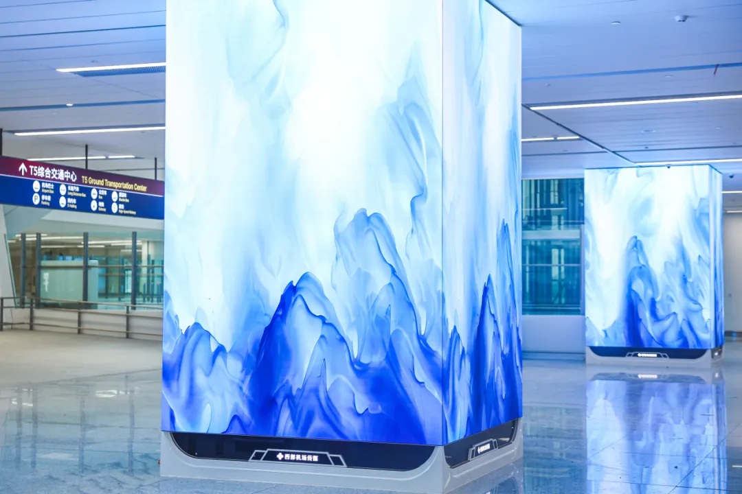 安檢區(qū)域迎賓柱屏作為旅客抵達(dá)的第一視覺焦點(diǎn),動態(tài)展示兵馬俑、大雁塔等文化IP,配合唐代紋樣數(shù)字藝術(shù)渲染,讓科技屏變身“文化大使”。