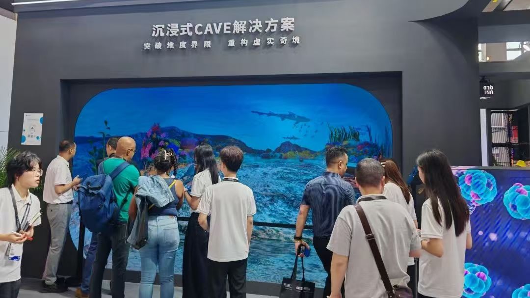 在主展示區(qū)中央,康碩展沉浸式五折幕系統(tǒng)格外吸睛。該系統(tǒng)構建出無縫銜接的環(huán)繞式虛擬空間,令觀眾視覺完全被包裹在流動的光影之中,無需佩戴任何設備,便能體驗到裸眼3D帶來的立體視覺沖擊。