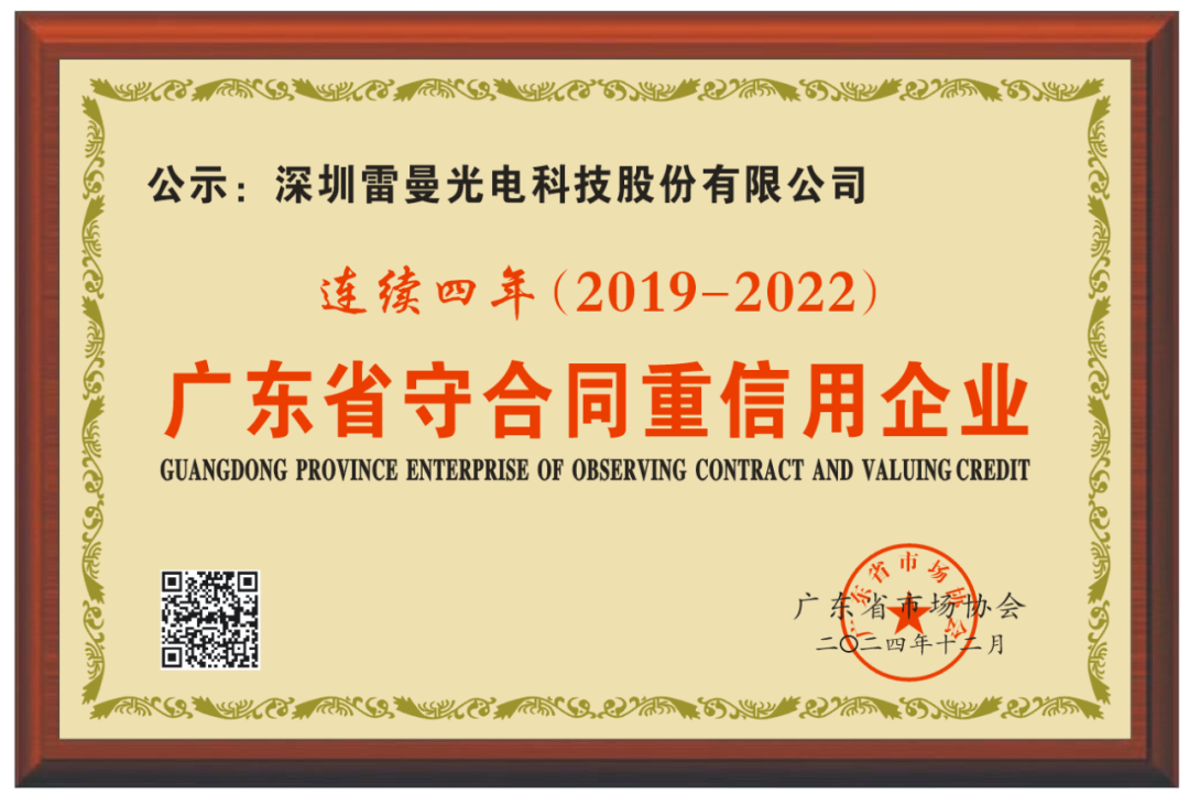近日,廣東省市場(chǎng)協(xié)會(huì)授予雷曼光電廣東省“守合同重信用企業(yè)”榮譽(yù)稱(chēng)號(hào),以表彰公司在守信經(jīng)營(yíng)方面的突出表現(xiàn)。雷曼光電依靠自身卓越的社會(huì)信譽(yù)和綜合實(shí)力,已連續(xù)四年獲評(píng)“廣東省守合同重信用企業(yè)”稱(chēng)號(hào),這是雷曼光電堅(jiān)持守法經(jīng)營(yíng)、深入推動(dòng)誠(chéng)信合作所取得的成果。