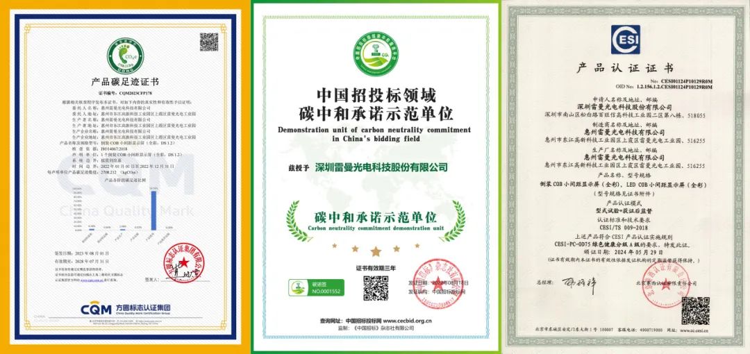 社會各界也對雷曼光電在可持續(xù)發(fā)展領(lǐng)域的卓越表現(xiàn)和持續(xù)努力給予高度贊譽和認可。2022年,雷曼光電被授予“碳中和承諾示范單位”稱號。2023年,雷曼PSE雷鳴系列COB節(jié)能冷屏獲得“產(chǎn)品碳足跡證書”。2024年,雷曼光電全系列COB一體機獲得一級能效標識,全系列COB小間距顯示屏也獲評綠色健康分級A級。同年,雷曼光電榮獲“ESG100綠色發(fā)展大獎-年度企業(yè)管治獎”。