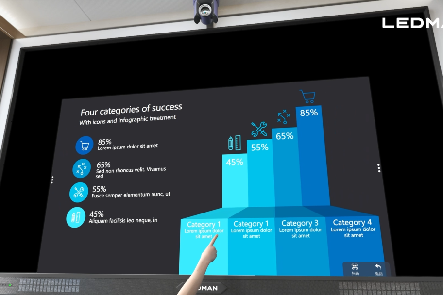 雷曼COB觸控交互一體機(jī)采用高靈敏度的觸控交互技術(shù),用戶通過簡單的觸控手勢就能實(shí)現(xiàn)觸摸控制、白板書寫、文本編輯、沙盤互動(dòng)等功能,大大降低操作難度,簡化了會(huì)議操作流程,提高了會(huì)議效率。