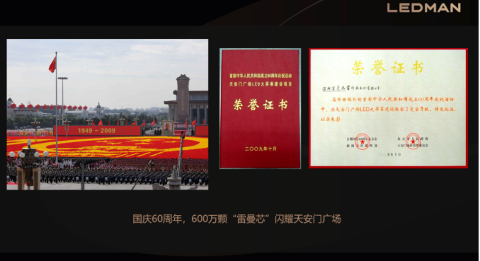 故事始于封裝。在LED產(chǎn)業(yè)鏈中,封裝環(huán)節(jié)扮演著至關(guān)重要的角色。雷曼光電在2004年創(chuàng)立初期,便敏銳地洞察到了封裝市場的巨大潛力。憑借精湛的工藝技術(shù)和嚴(yán)格的質(zhì)量控制,其迅速在封裝領(lǐng)域嶄露頭角,而后拿下國慶60周年的天安門廣場閱兵式的超大型LED顯示屏器件的唯一指定國產(chǎn)品牌,贏得了眾多客戶的信賴和市場的認(rèn)可。
