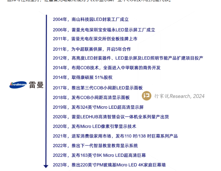 行家說Research:綜上,縱觀20年發(fā)展,雷曼光電明確了技術(shù)創(chuàng)新與市場拓展雙輪驅(qū)動的戰(zhàn)略模式,COB封裝技術(shù)和Micro LED顯示技術(shù)的創(chuàng)新、廣泛的市場應(yīng)用、前瞻性的戰(zhàn)略布局,為其贏得了市場競爭優(yōu)勢。
