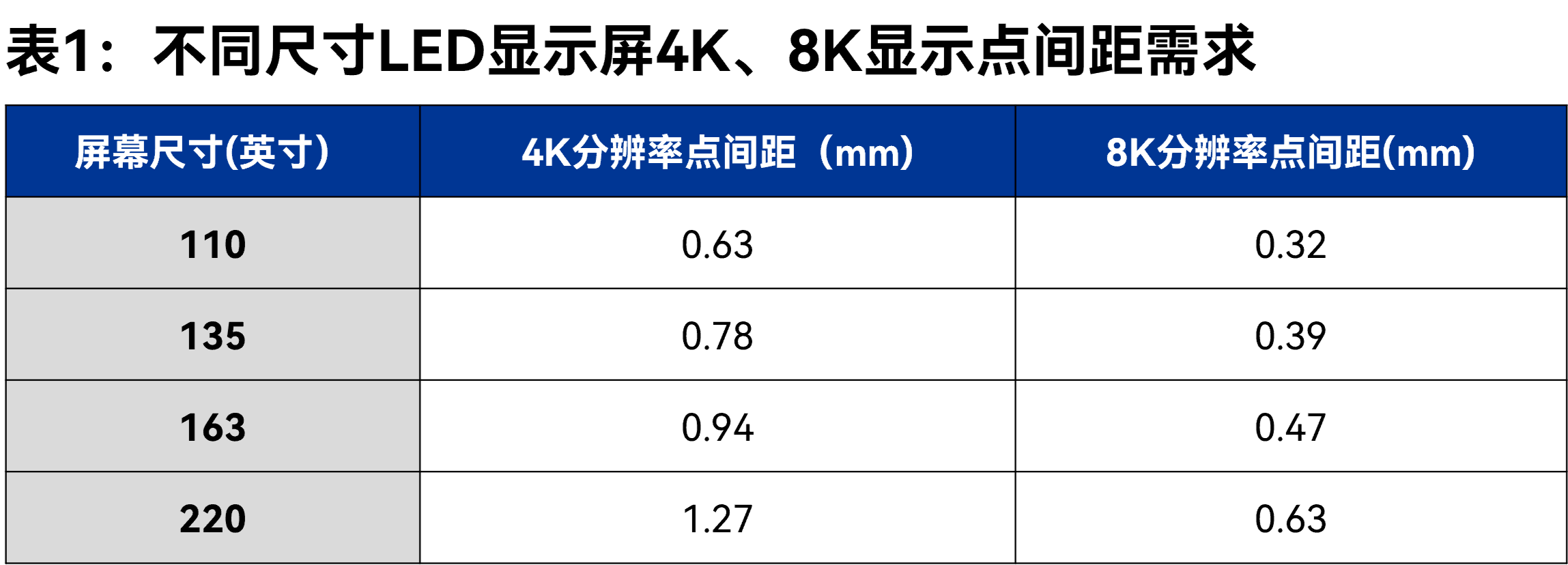 100英寸以上的大尺寸戶內(nèi)顯示中點(diǎn)間距直接決定畫面清晰度,163英寸屏幕實(shí)現(xiàn)4K(3840×2160)分辨率需P0.94mm間距,8K(7680×4320)分辨率則需P0.47mm。目前主流廠商通過(guò)倒裝芯片與微米級(jí)COB技術(shù),已將點(diǎn)間距降到0.9mm以下,其中雷曼光電等企業(yè)實(shí)現(xiàn)P0.47mm量產(chǎn),推動(dòng)4K、8K超高清顯示在指揮監(jiān)控、商用會(huì)議、家庭影院等全場(chǎng)景落地。